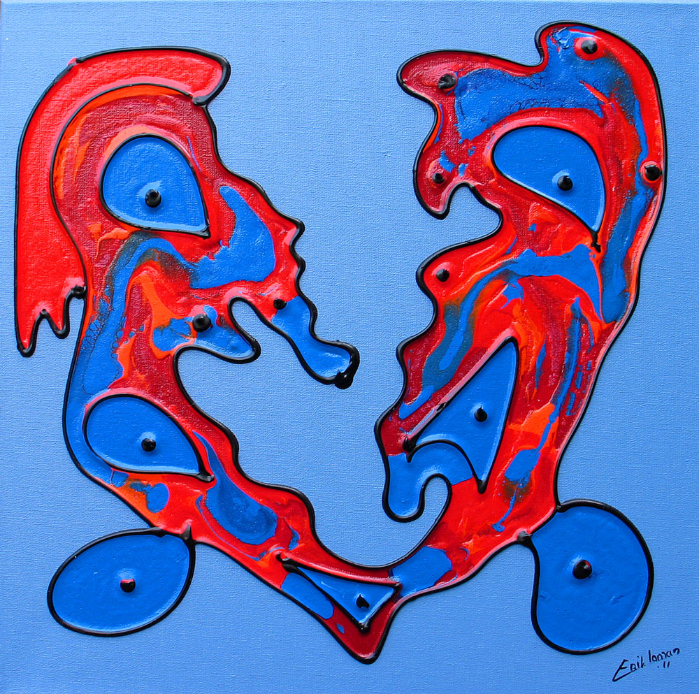 Modern kleurrijk schilderij van kunstenaar Erik Loman. Acryl op linnen, 50x50x4cm, 2010.