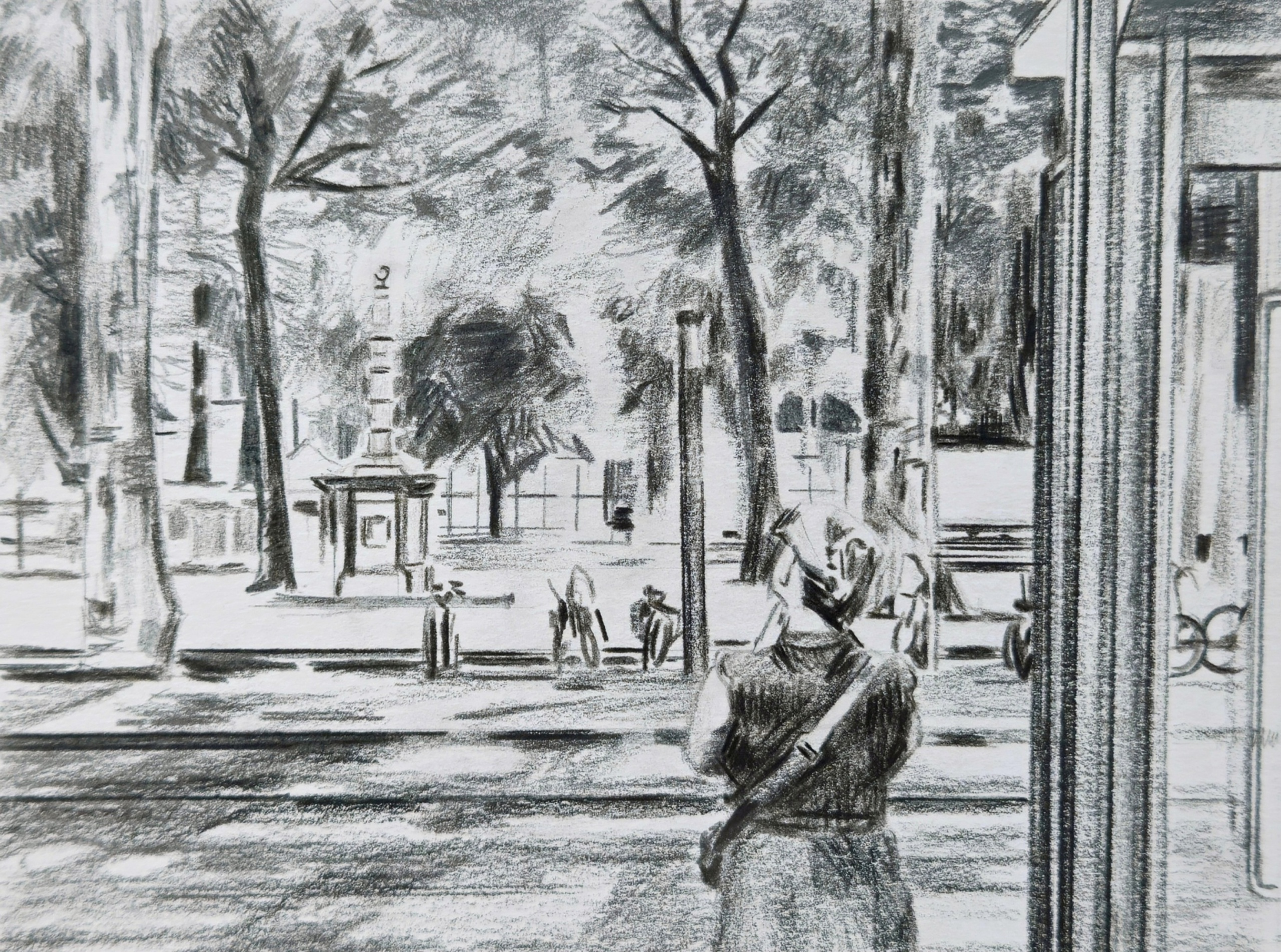 Potlood Tekening Stadsgezicht Verhalend Vrouw Fietsen Plein