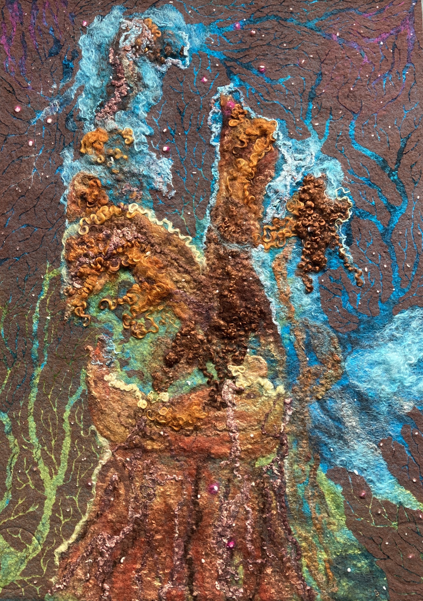 "Oorsprong" is een werk van wol en zijde. Geïnspireerd op foto's van ESA en NASA van het heelal en de aardelaarsnevel. Onmetelijk groot en heel mysterieus, is het gevoel dat mij aanzet tot het maken van dit werk.