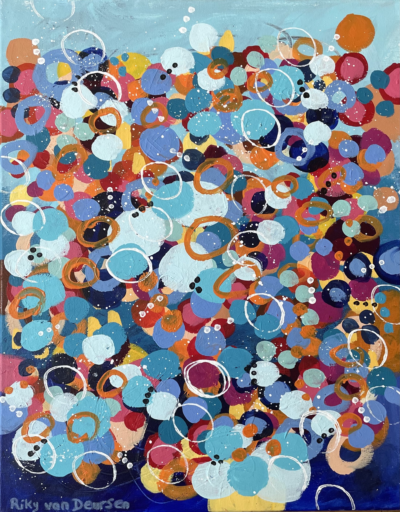 Dit schilderij begon zonder vast plan—alleen vanuit een gevoel. Een rustig, open blauw vlak vormde het vertrekpunt. Van daaruit liet ik het werk intuïtief ontstaan, reagerend op elke laag zoals die zich aandiende. Zachte vormen verschenen, daarna clusters, daarna ritmes. Kleuren ontmoetten elkaar, overlapten en dreven weer uit elkaar. Wat begon als ruimte, transformeerde langzaam in beweging. Tijdens dit proces kreeg een stille gedachte vorm: vreugde is geen enkel moment—het verzamelt zich. Het leeft in de kleine dingen die we vaak over het hoofd zien. Een vluchtige gedachte, een verandering in licht, een gevoel van gemak. Op zichzelf lijken ze bijna gewichtloos. Maar samen vormen ze iets dat vol, levendig en intens aanwezig is. In Where Joy Gathers staat elke markering voor zo’n fragment. De gelaagde cirkels en vloeiende vormen weerspiegelen hoe ervaringen zich met elkaar verbinden—soms zacht, soms onverwacht—en zo een visueel veld creëren dat tegelijk energiek en rustgevend aanvoelt. Het schilderij nodigt de kijker uit om stil te staan en erin rond te dwalen. Om details op te merken. Om beweging te voelen. En misschien om hun eigen momenten van vreugde erin te herkennen. Want vreugde komt niet altijd in één keer. Soms verzamelt ze zich.