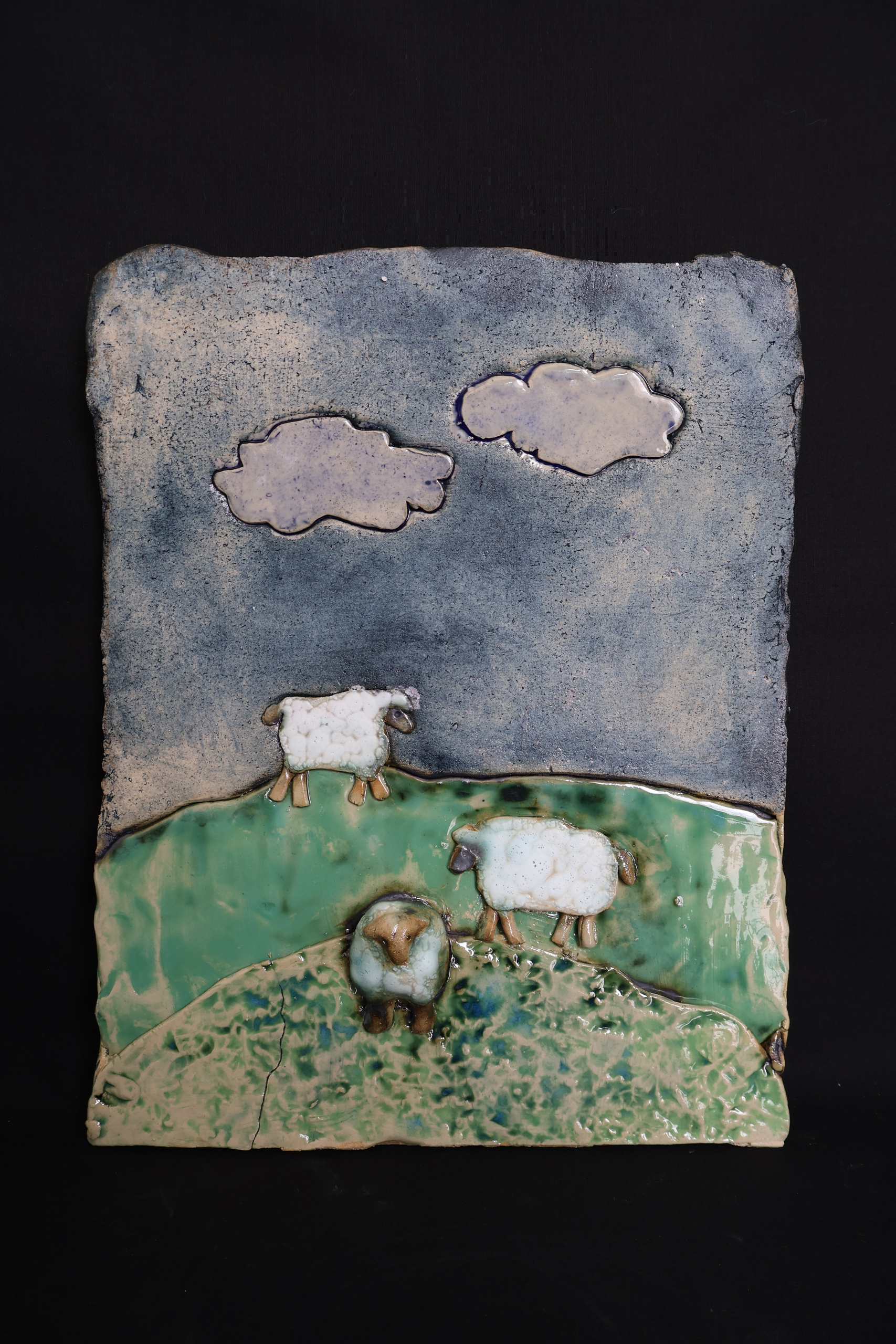 Een schilderij van keramiek, met subtiel reliëf en diepte. Eén van de drie schapen komt iets naar voren en geeft het werk een speels accent. Weer eens wat anders — een techniek die ik lang geleden ook al eens gebruikte, maar die hier opnieuw tot een bijzonder resultaat leidt. Leuk voor binnen en buiten.