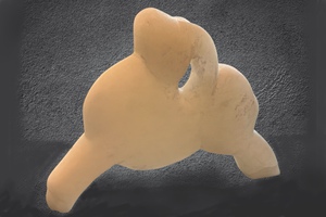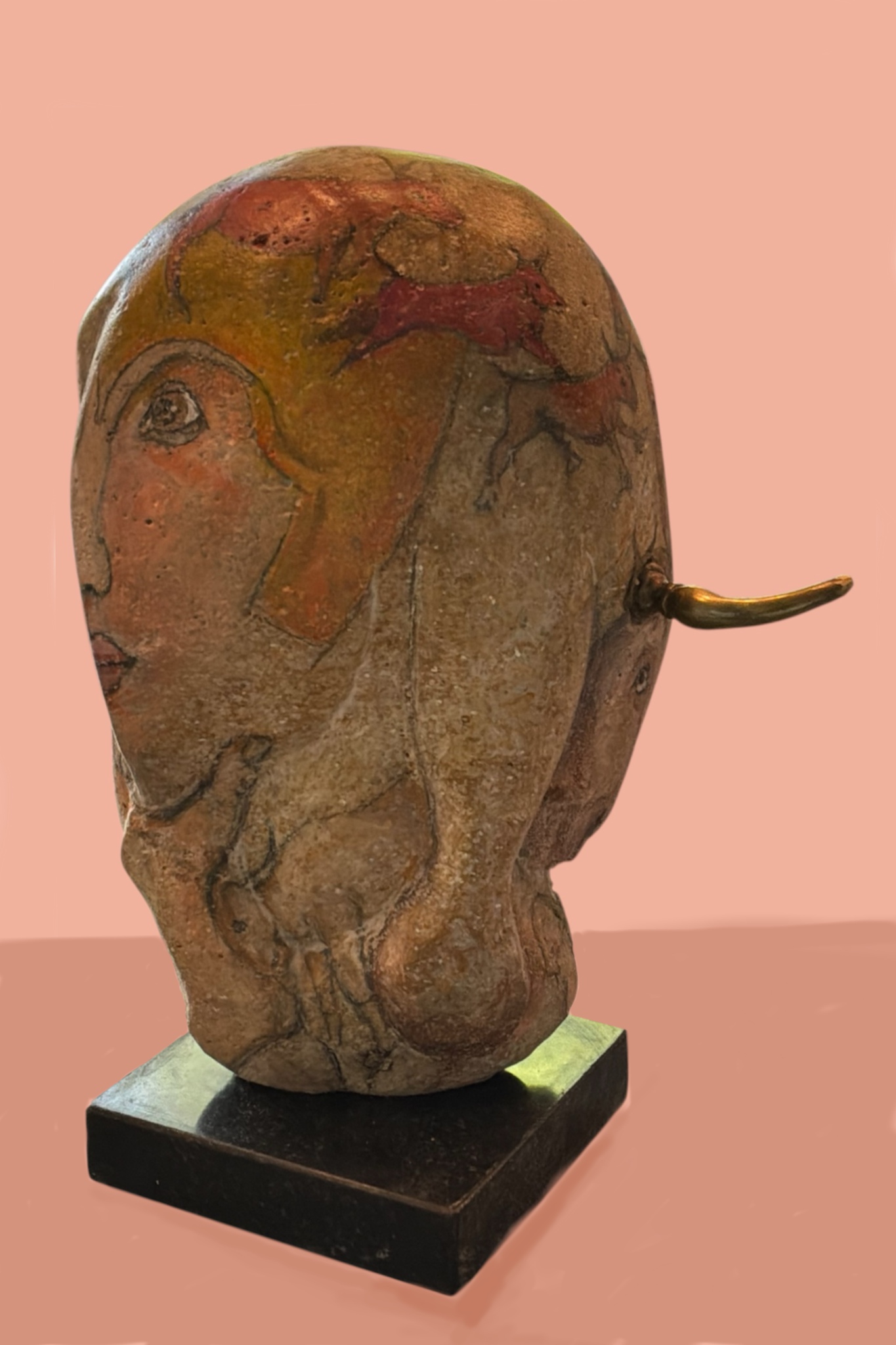 Rainbow zandsteen, beschilderd, messing horens. In de beschildering van deze gebeeldhouwde steen ga ik uit van de kleuren en tonen die deze kleurrijke steen biedt. Het thema is een herinnering aan de grotschilders uit de Prehistoire, die op de wanden van de grotten schilderingen maakten met pigmenten, koolstof e.d.