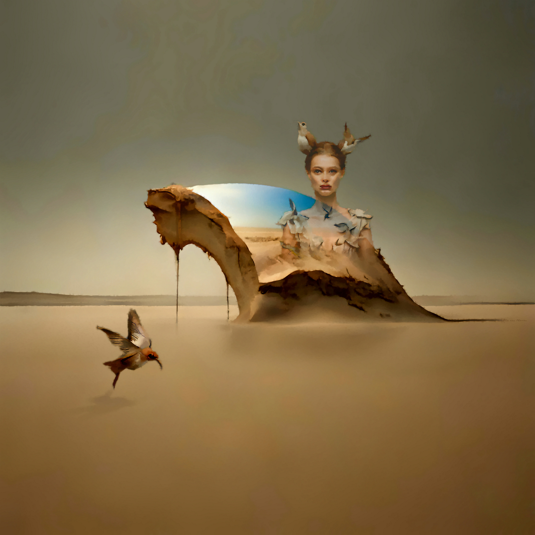 Gevangen Door De Kust Verankerd In Het Zand Strand Vogels Vrouw Duinen Digital Art Blauw Bruin Wit Grijs Groen