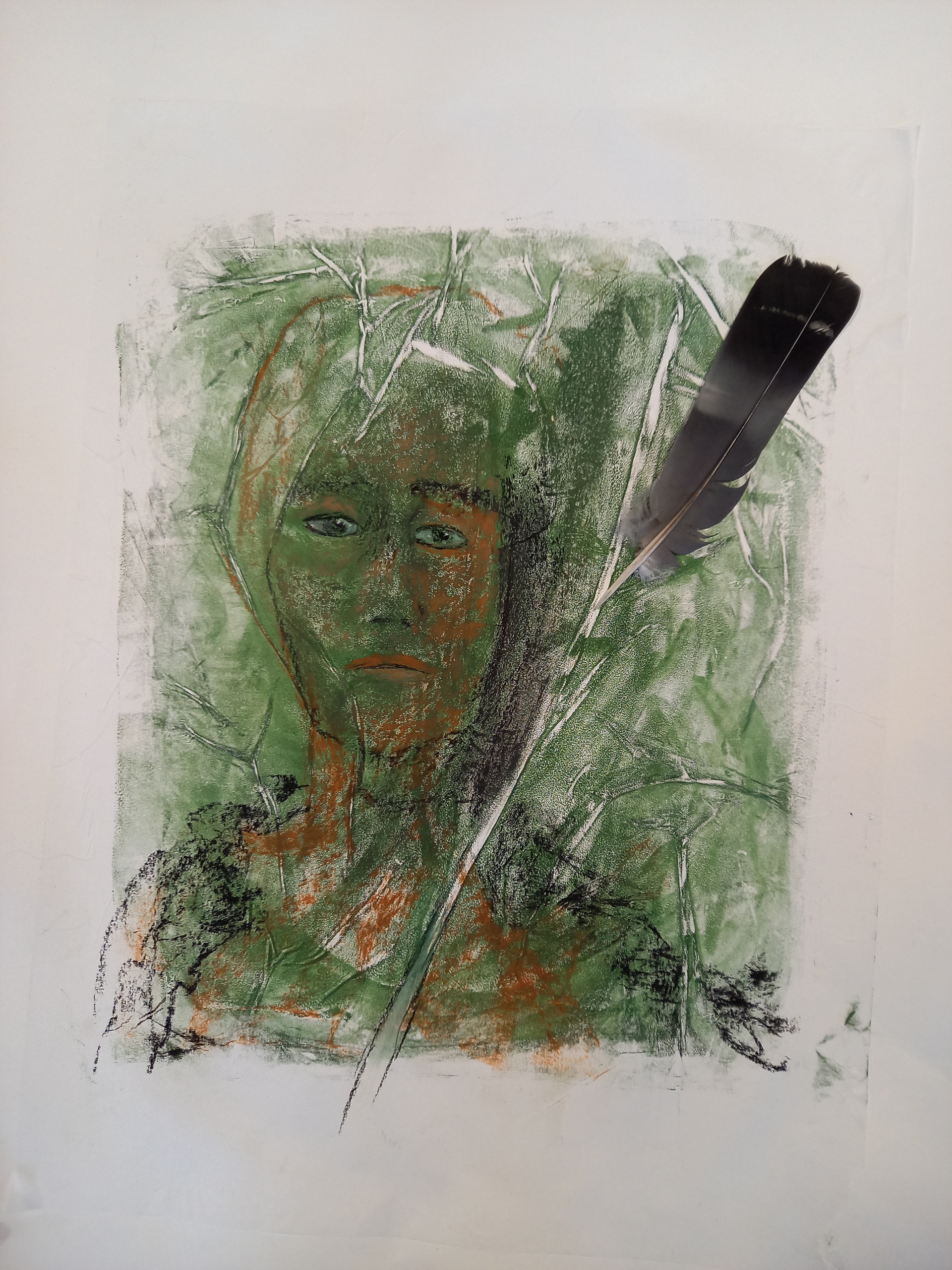 touchdrawing-afdruk, vrouw met veer, strijder
