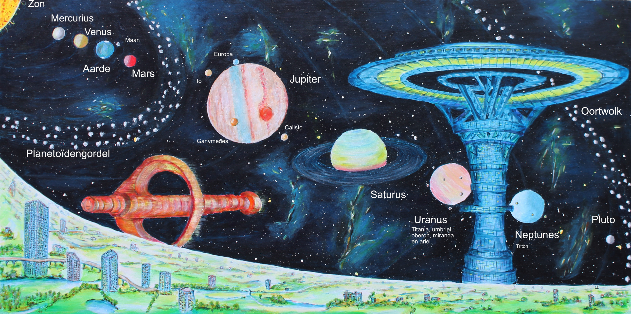 Space II toelichting Catalogus 413. Hypothese: planeet Y heeft ooit bestaan en is op de een of andere manier verwoest, waarna de brokstukken in een baan rond de zon gingen — de zogenaamde planetoïdegordel. Deze hypothese intrigeerde mij. Om het te verbeelden heb ik dit schilderij gemaakt. De kleuren van de planeten zijn zo waarheidsgetrouw mogelijk weergegeven.
