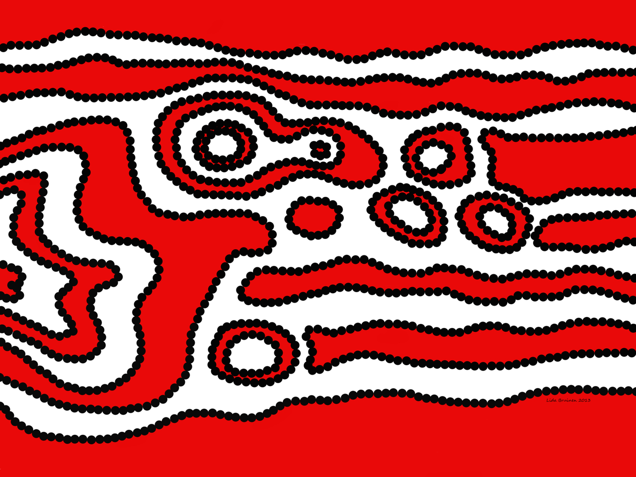Geïnspireerd door de dotpaintings van aboriginal art. Een stromingsbeeld. Laat de passie stromen. Rood is de kleur van kracht, passie, hartstocht. Voor prints zie de website LidaBruinen.werkaandemuur.nl of neem contact met me op
