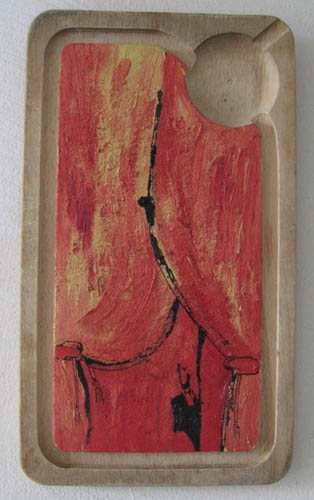 Deze Nihilistisch hedendaags existentieel beeldend kunstenaar verkiest als draagvlak voor zijn in olieverf uitgewerkte iconen alledaagse gebruiksvoorwerpen van hout.