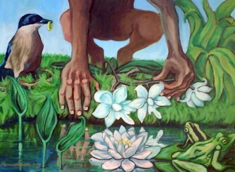 Waterkant met hurkend figuur, orchidee, kikkers, vogel en waterlelie.