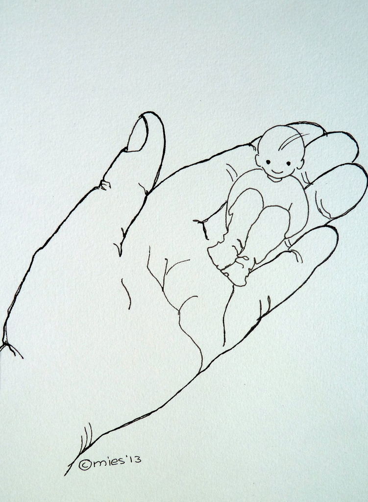 Kindje ligt in hand volwassene