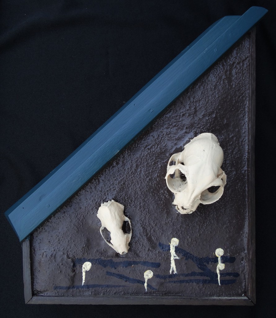 Kort na de sluiting van de nertsenfarm nabij, vonden we de schedel van een wilde kat (mogelijk slachtoffer van een ontsnapte nerts) en de schedel van een nerts (dood na ontsnapping). "Natuurlijke" vijanden samen genomen. Dit relief is voor aan de muur