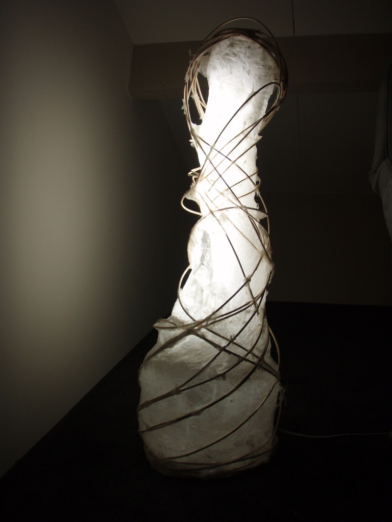 Lamp van rijstpapier en boekbinderslijm en pitriet.