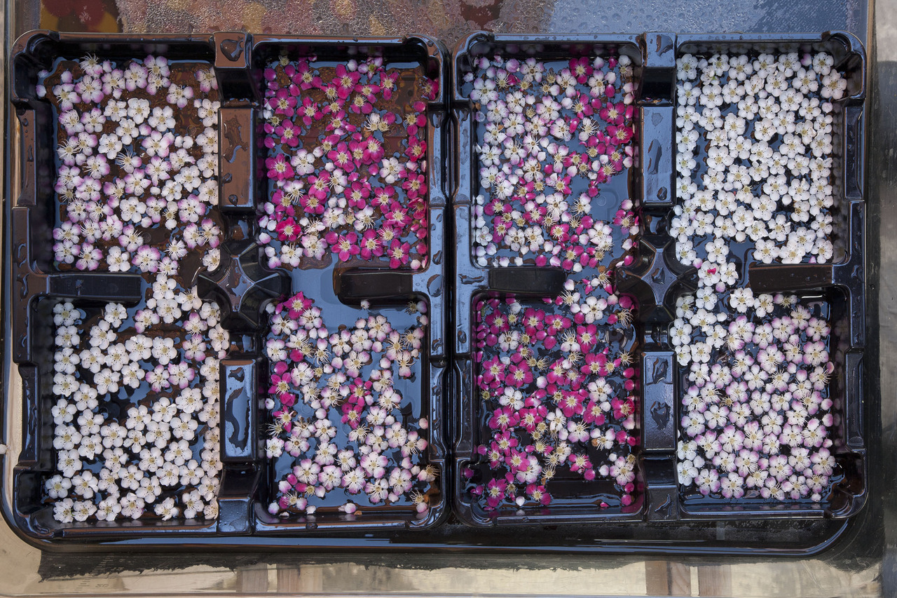 bloemstilleven met witte, rose en rode meidoorn in zwarte plantentray