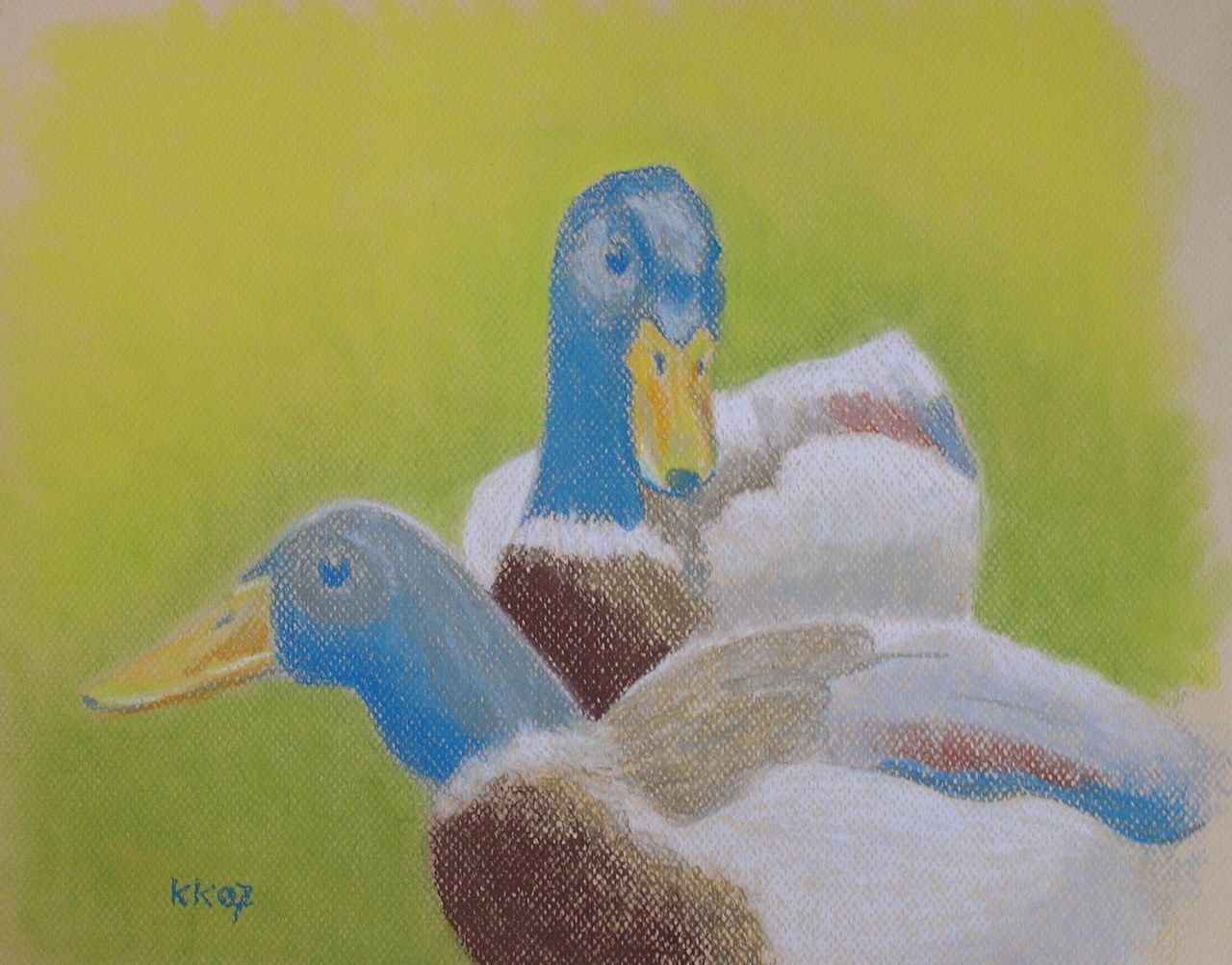 Twee eenden voor een eenvoudig gekleurde achtergrond.