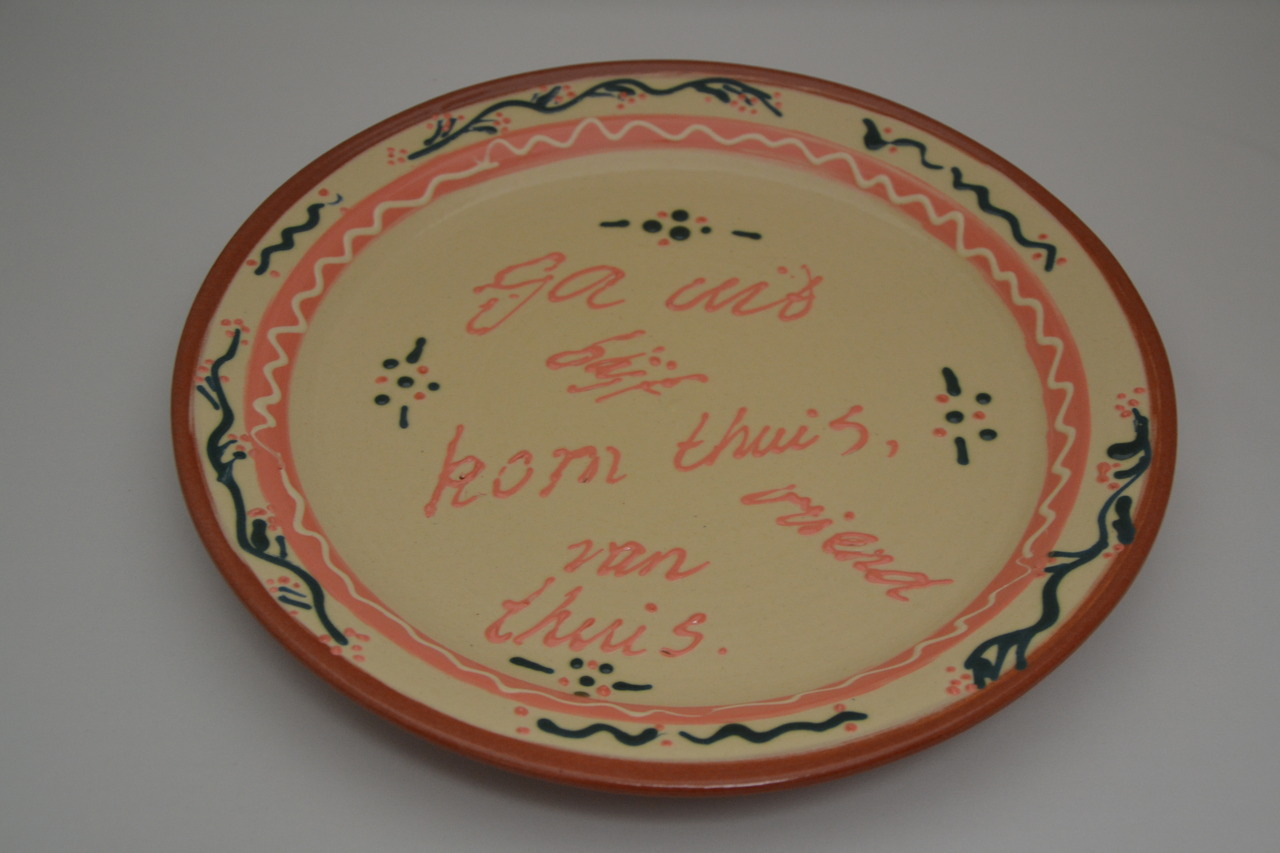 Aardewerk Steengoed Gestookt Keramiek Gebruiksgoed Borden Schaal Sierbord Sierborden Engobe Engobes Kleislib Glazuur Ringeloor Bruin Terra Terracotta Wit Roze Rood Blauw Groen Tekst Letters Opdracht