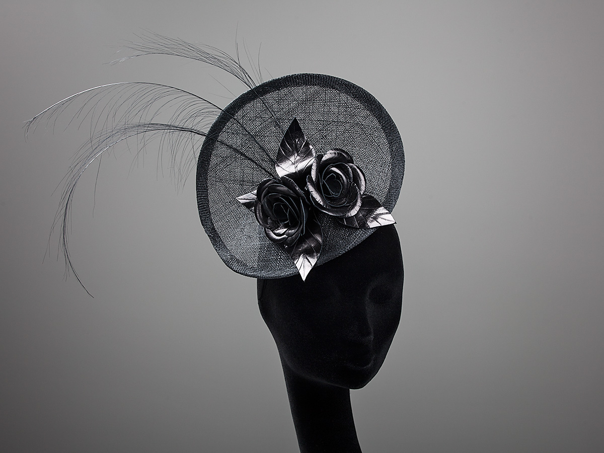 zwarte fascinator of cocktailhoed in sinamay met zwarte laklederen bloemen en paradijsvogelveren aanpasbaar met elastiek of haarklemmetjes