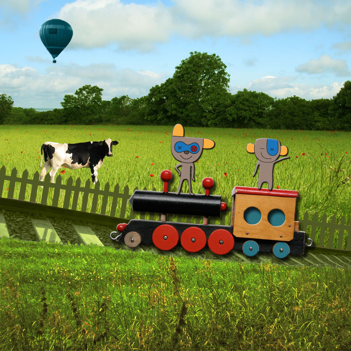 De 2 door mij bedacht en ontworpen karakters Bikkel en Skip staan op een houten speelgoedtrein. De trein rijdt door een weiland met gras, klaprozen en een koe. In de lucht zweeft een luchtballon. Het is een digitaal gemaakte collage met foto's en vector tekeningen.
