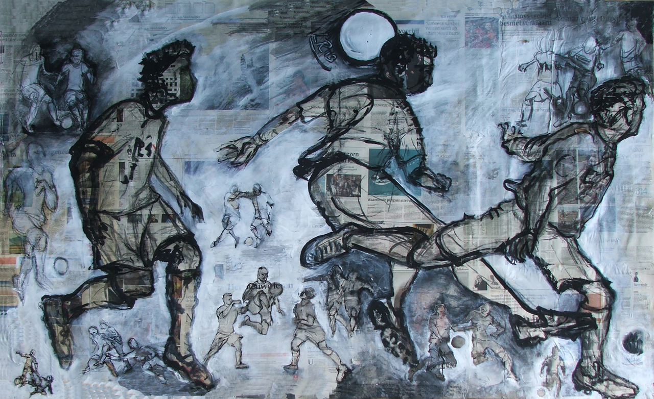 Tekening gemaakt op krantenpapier, speciaal voor expositie Kunstenonder1dak in het voetbalstadion