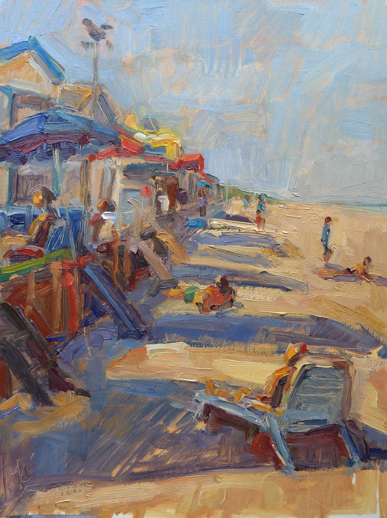 'Ochtendlicht' strandhuisjes plein air geschilderd op het Hollandse strand vlak bij Egmond aan Zee.