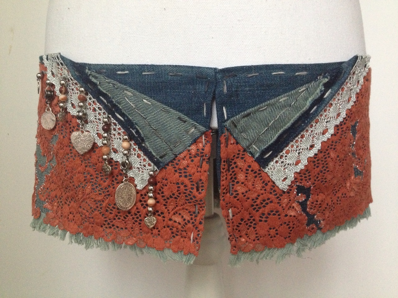 Spijkerstof ceintuur/ rokje ontwerp met kant in terra cotta kleuren. Kant is met zilverdraad opengewerkt en zilveren bedels sieren de sluiting. Handgemaakt, exclusief design. De foto toont het achteraanzicht.