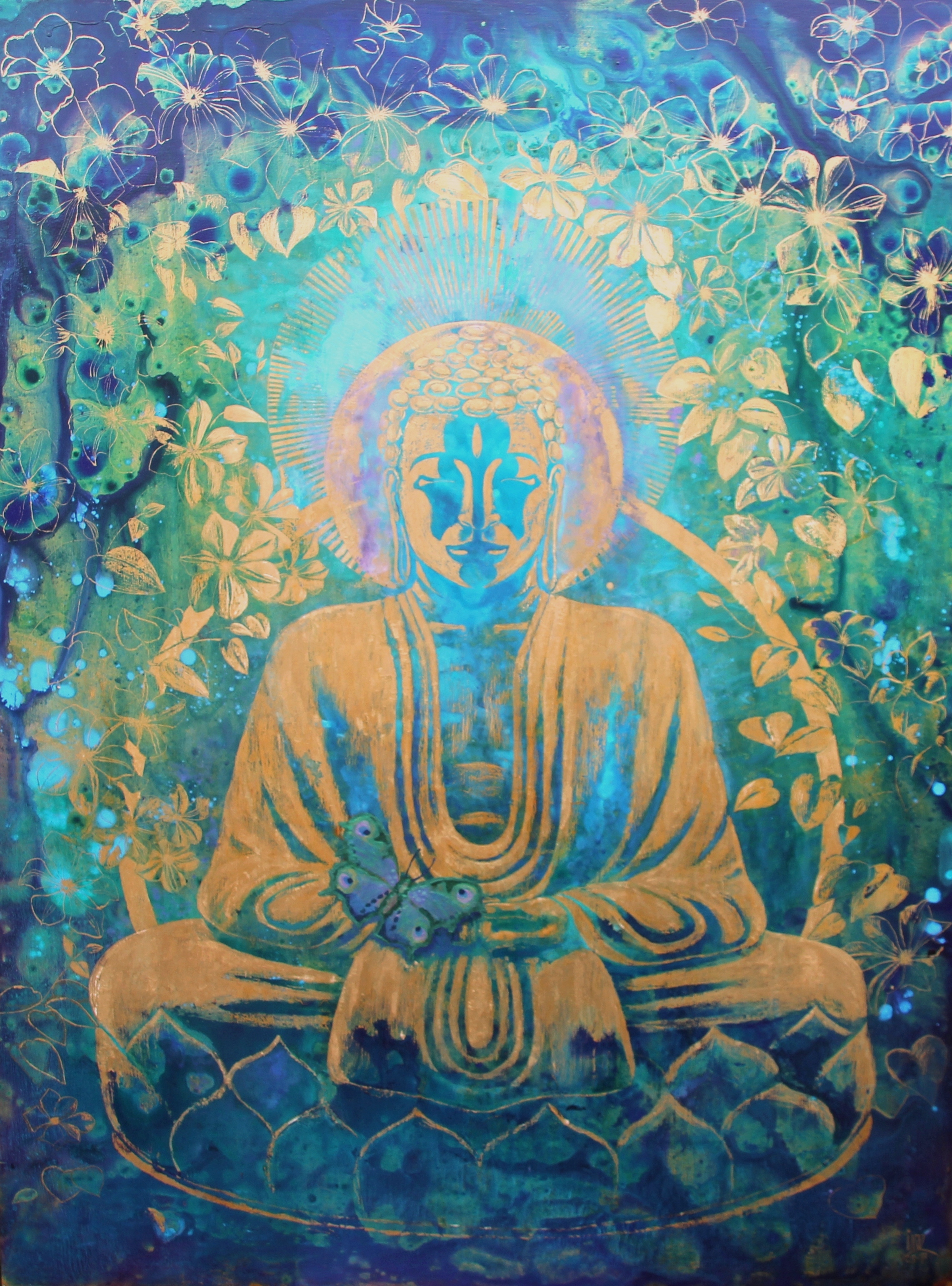 Boeddha als een icoon geschilderd op een gouden ondergrond.