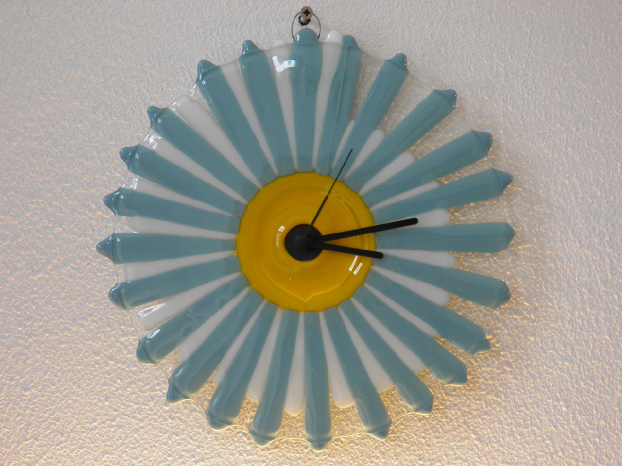 Klok glasfusie. Witte bloemblaadjes worden langer in de tijd.