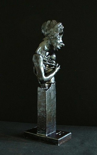 keramisch beeld, staand vrouwelijk naakt, halfbeeld, uit zwarte fijne klei in zwarte olieglazuren met veel uitstraling