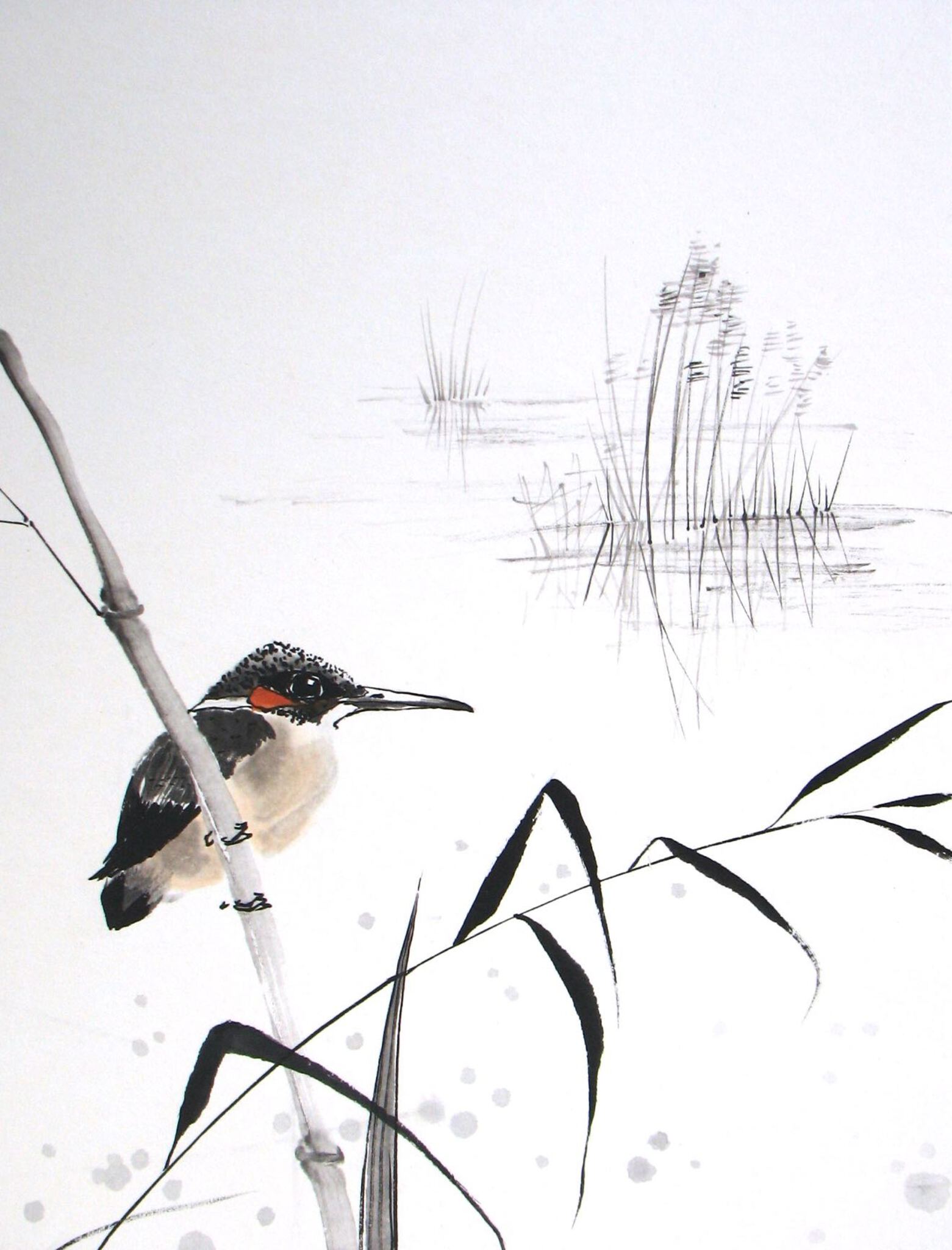 Vogel Inkt Bird Ijsvogel Schilderen Nature Rijstpapier Ink Ricepaper Kingfisher Ditch Sumi-e