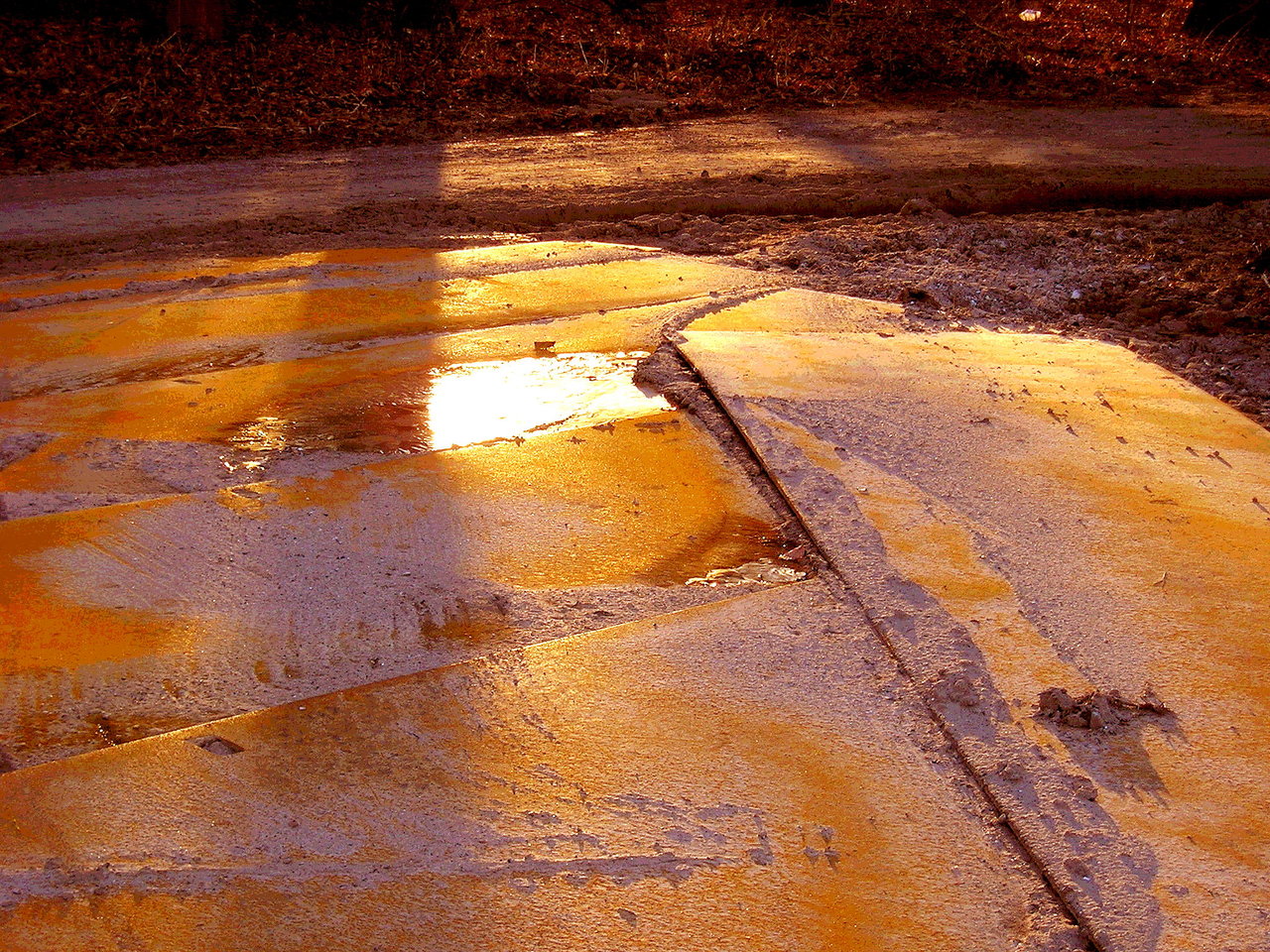 Licht gereflecteerd op roestige rijplaten.