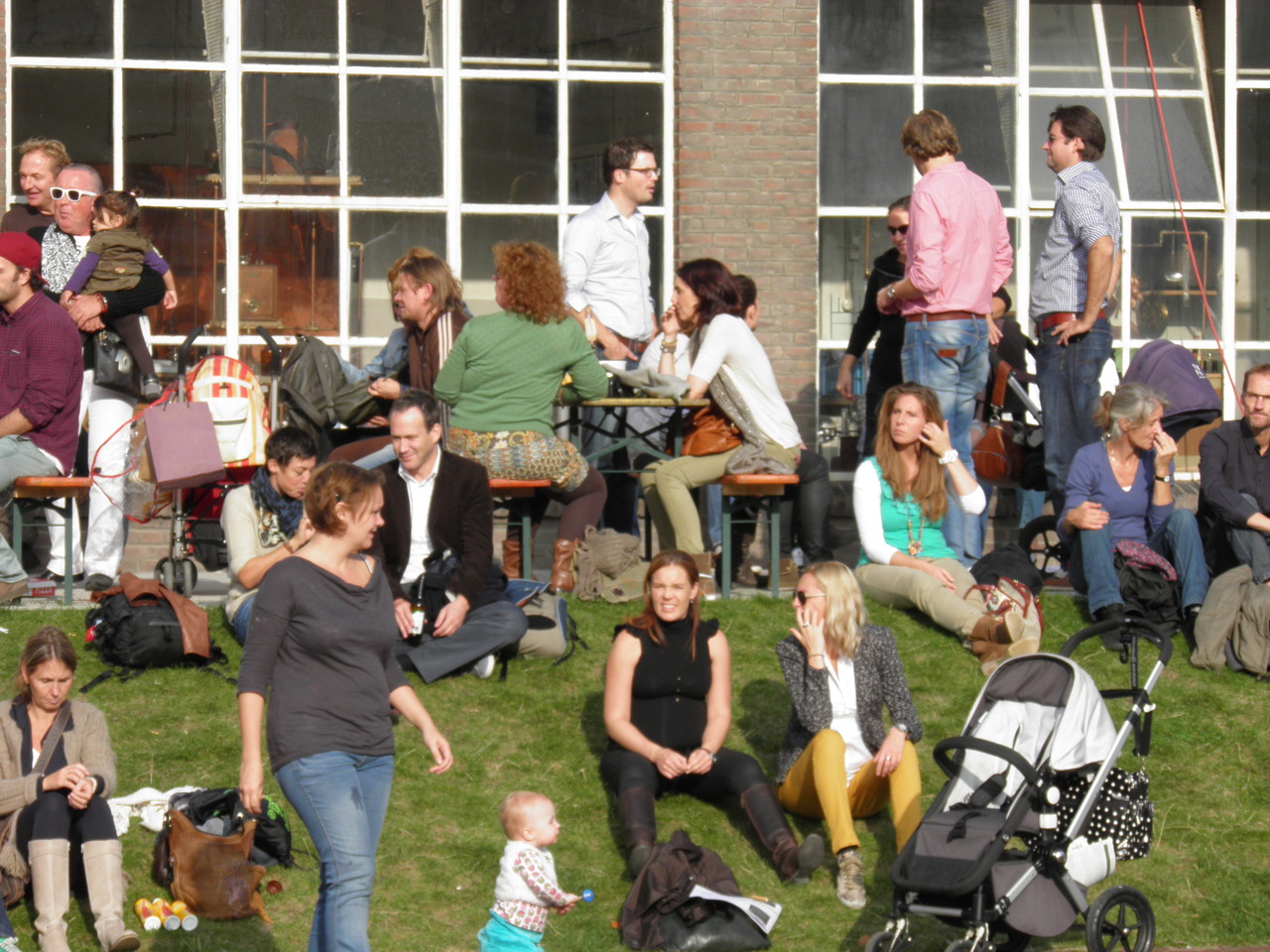 Een mix van jongeren en ouderen ieder met zijn eigen bezigheden.