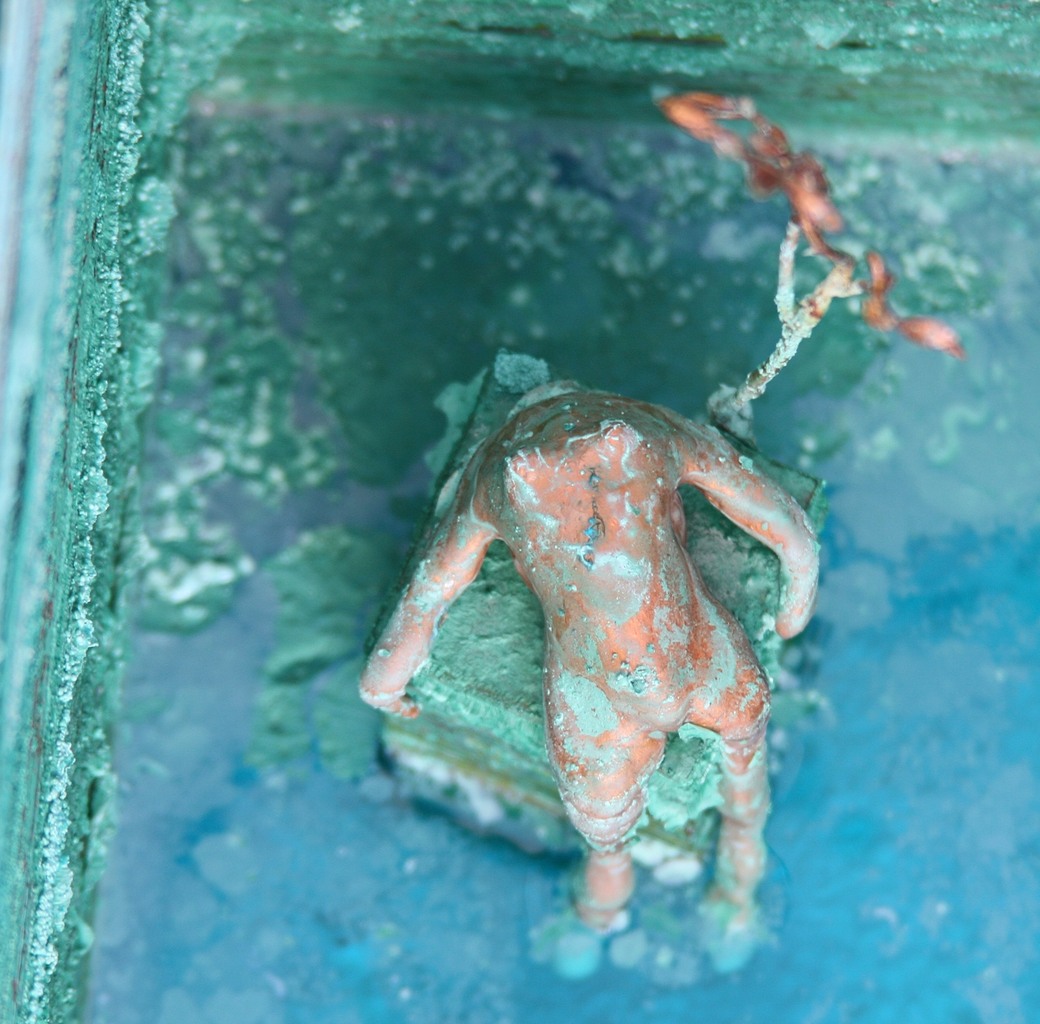mijn foto’s zijn analoog gemaakt, een vastlegging van licht dat er net als de schimmige figuren maar heel even was. Dezelfde thematiek is te zien op de koperplaten. Deze zijn extreem lang geëtst, waardoor openingen, oxides en structuren ontstaan die het beeld bepalen. De op deze manier imperfecte, want aangetaste mensfiguren vertellen hun verhaal door hun houding en plaats in de ruimte. Tegelijk is duidelijk te zien dat de afbeelding vóór het etsen anders, misschien wel compleet was.